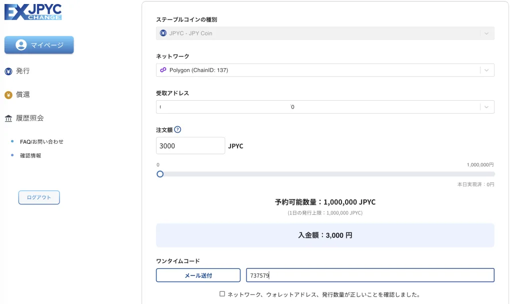 そして早速発行!しようと思ったのですが、なぜか100万円しか発行できない。。。いや、1万円だけ発行しようと思ったのに、注文学の数字を変更しても変わらない。。。なぜだ・・・ ということで、今日は発行せずに一旦保留で確認してみます。