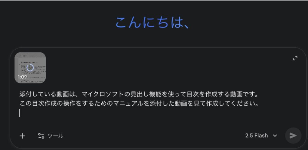 Geminiだと他のAIより動画の内容の読み込み精度が高いということでGeminiに動画をアップロードして、読み込んでもらいました。