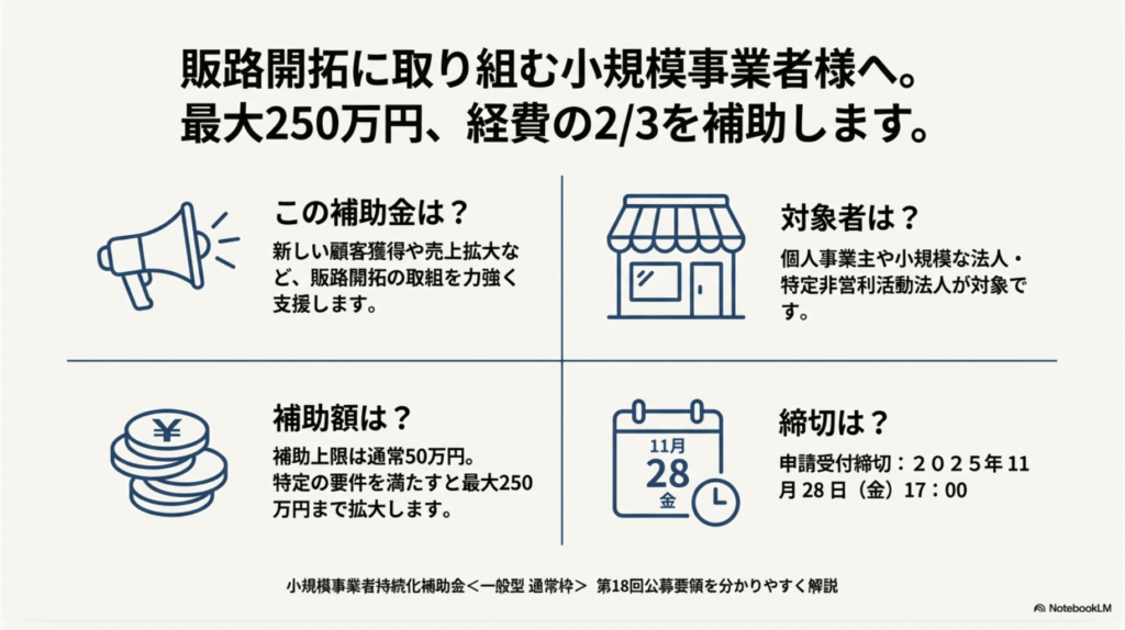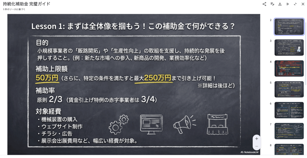 引き続き、小規模事業者持続化補助金の公募要領からスライドを作ってもらいました。15ページのスライドが作成されました。