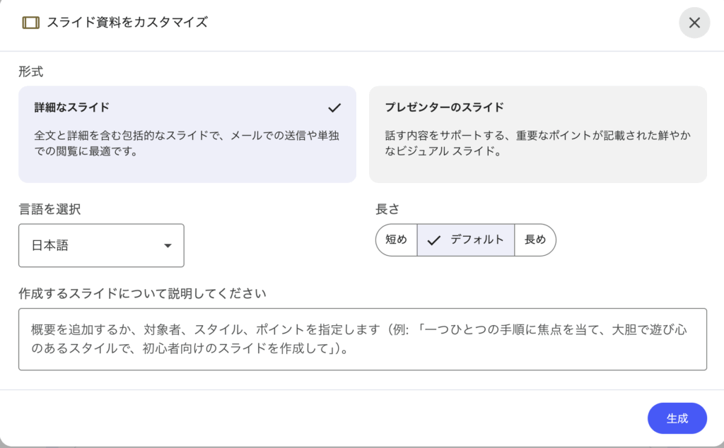 細かく設定して、スライド生成もできる