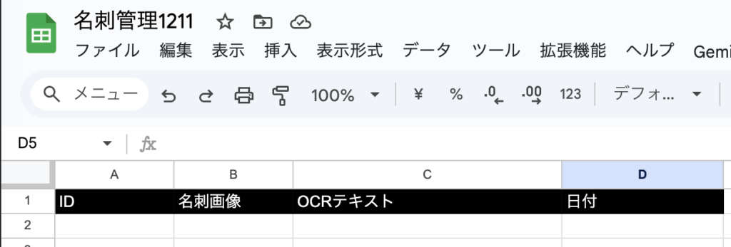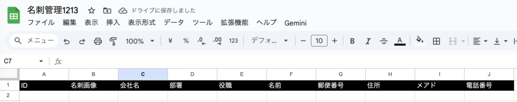 最低限の項目で実施していきます。まずはスプレッドシートを作りました。名刺管理1211という名前にしました。
