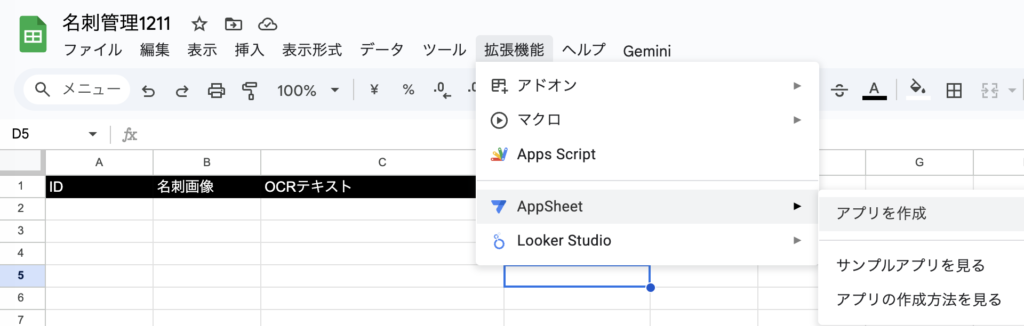 拡張機能からAppSheetを選んで、”アプリを作成”します。