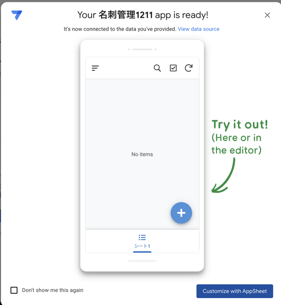そうすると、なにかアプリを作ってくれました。Customize with AppSheetへ進みます。