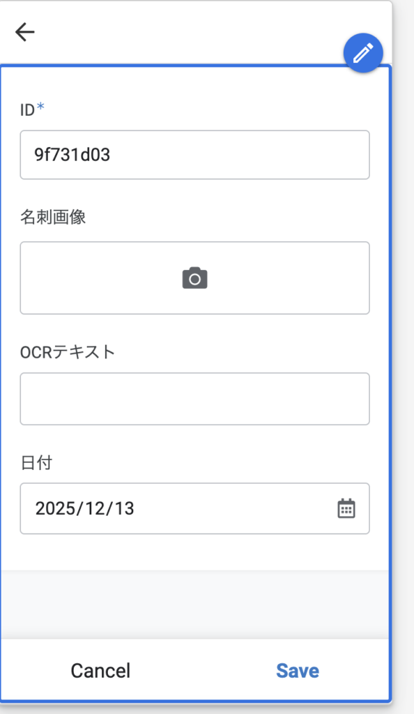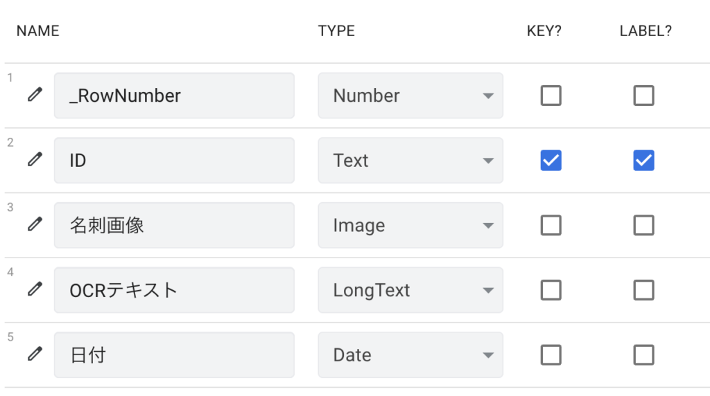IDは自動で数値を入れて、名刺画像を登録する項目、そしてその画像をOCRしていれる項目、そして登録した日付を入れる項目の4つです。