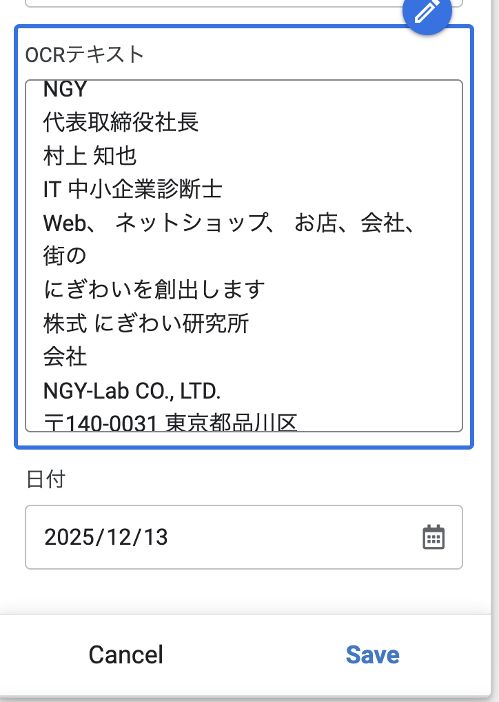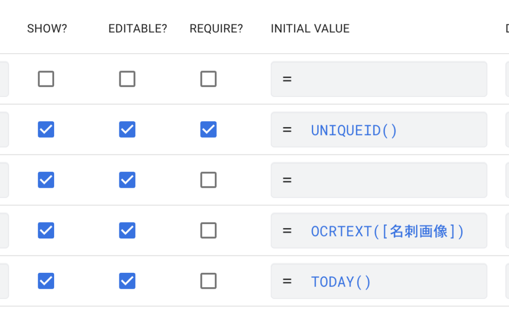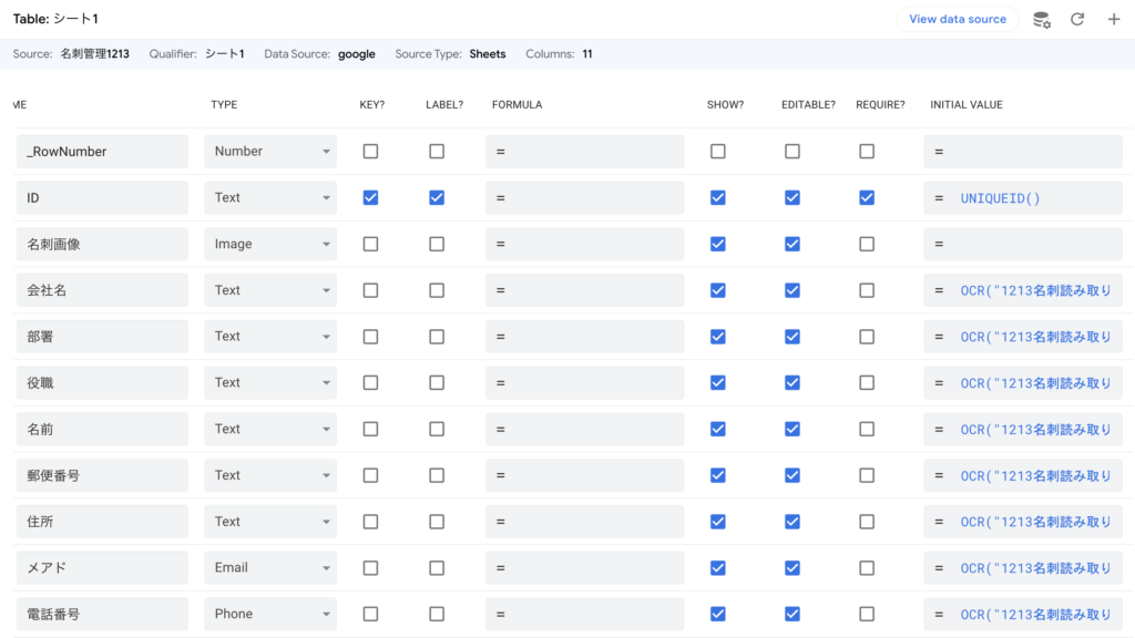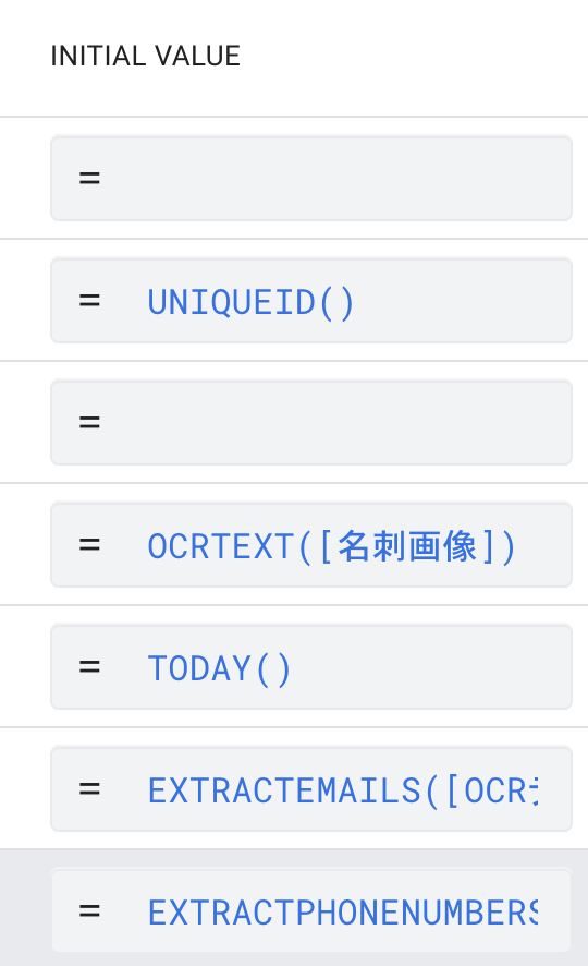 名刺画像をOCRして読み込むので、OCRテキストの項目には ”OCRTEXT([名刺画像])”と入れました。