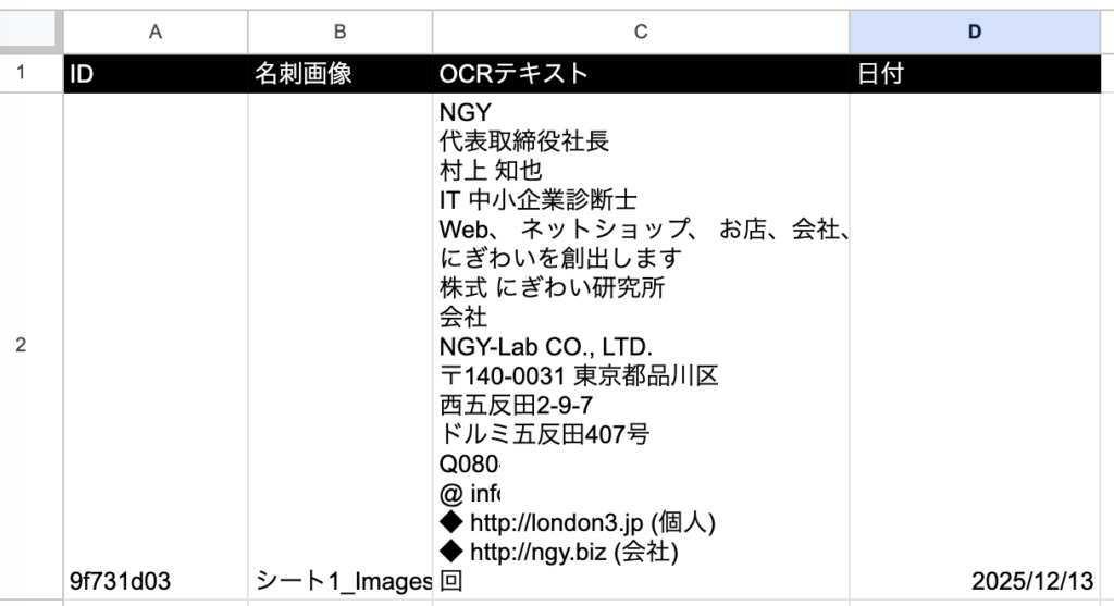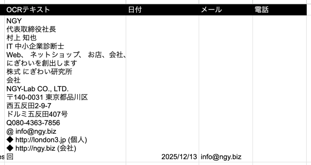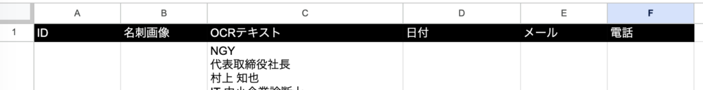 スプレッドシートにもデータが溜まっていました。 OCR完了ですね。