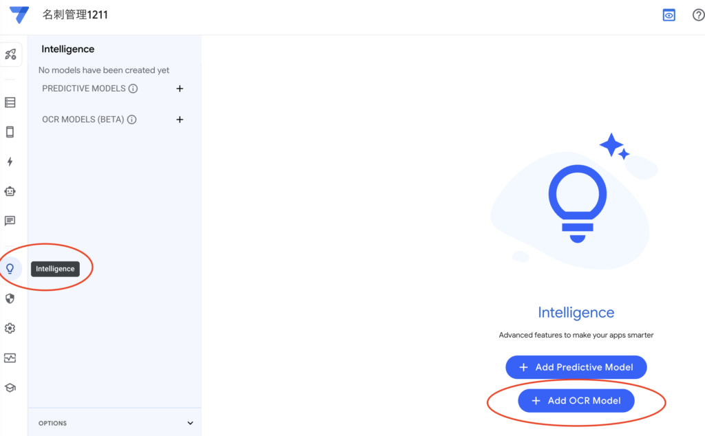 機械学習でOCRを教育して、名刺画像から、それぞれの必要な項目をセルに掘り込んでくれるかというものです。左のIntelligenceから、Add OCR Modelを選んでみました。