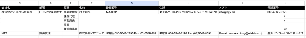 学習ようにそれぞれ会社名や部署などを入力しました。名刺によっては、電話番号が無いとか、役職が無いとかありましたが、うまくいくでしょうか。