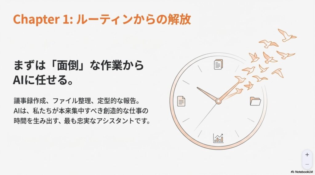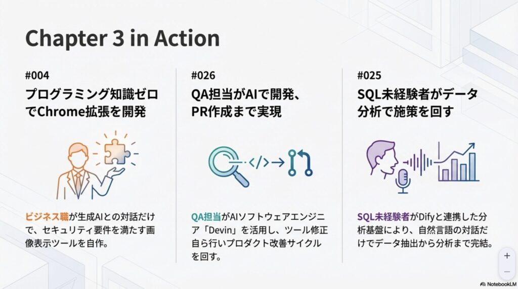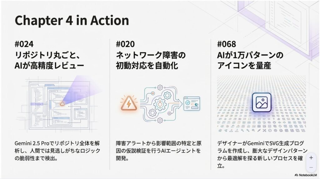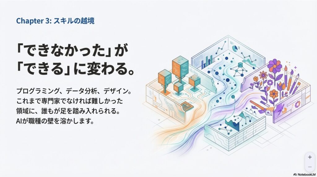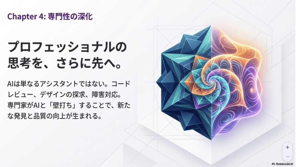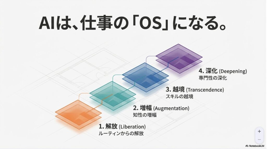 NotebookLMでスライドにまとめると、解放→増幅→越境→深化と。言葉の付け方は格好つけすぎだとは思うのですが、それぞれの4ステップ(Chapter)の内容を見るといいまとめになっていますね。自分的にはChapter1,2まではやっているけど、3以降はなかなか、開発の話も多くて進めていないです。