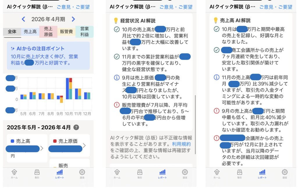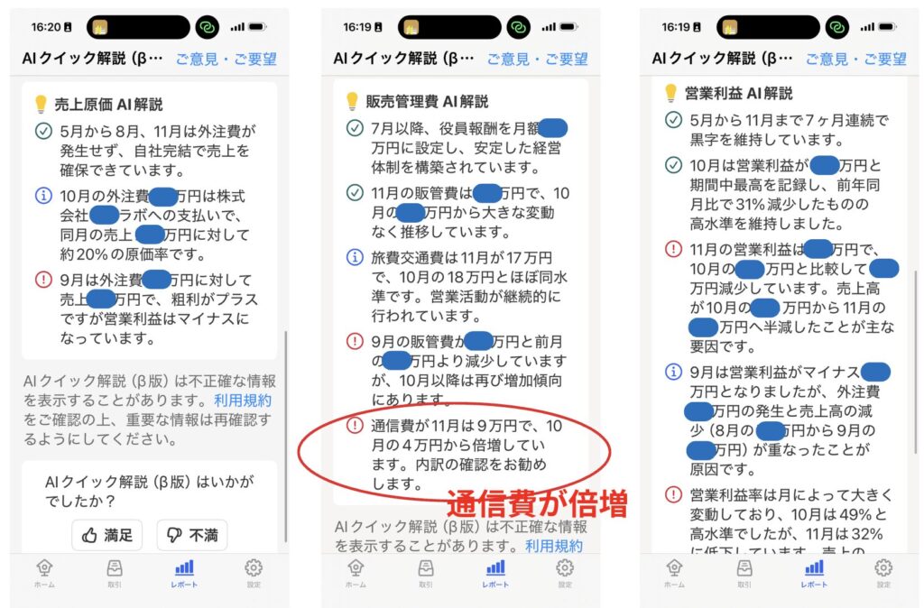 ということで、毎月の費用や売上の変動を、テキストで解説してくれるのは、悪くはないかなあと思います。