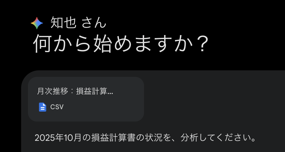 決算書や試算表をAIで分析することは可能です。ただChatGPTで分析しようと思うと、経理の数値をAIに伝えないといけないです。例えば月次の損益計算書をCSVファイルで会計ソフト(Freee)からダウンロードして、Geminiに2025年10月の状況の分析をお願いしました。