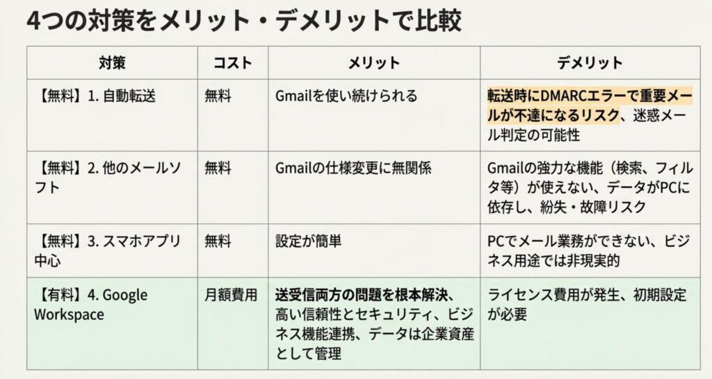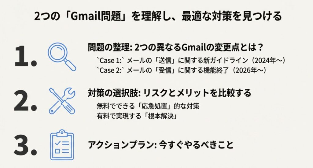 学習のヒント: これまで使えていたPOP方式が終了するのは、セキュリティの向上と、より安全で便利なクラウド同期への移行を促すGoogleの戦略の一環です。では、私たちは具体的にどの対策を選べば良いのでしょうか?次のセクションで見ていきましょう。