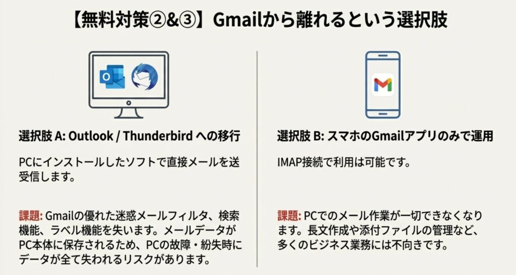 ◦ 仕組み: Gmailでの集約をやめ、PCにインストールしたOutlookやThunderbirdなどのソフトに、独自ドメインの情報を直接設定して運用します。