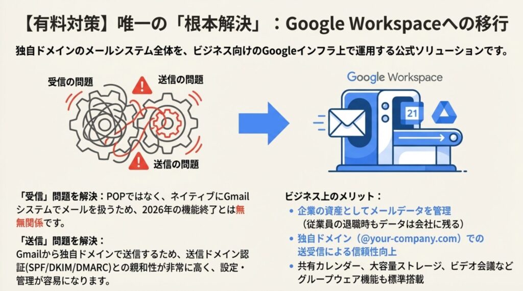 ◦ 仕組み: Googleの有料法人向けサービスを契約し、独自ドメインのメールをGoogleのサーバーで直接運用します。