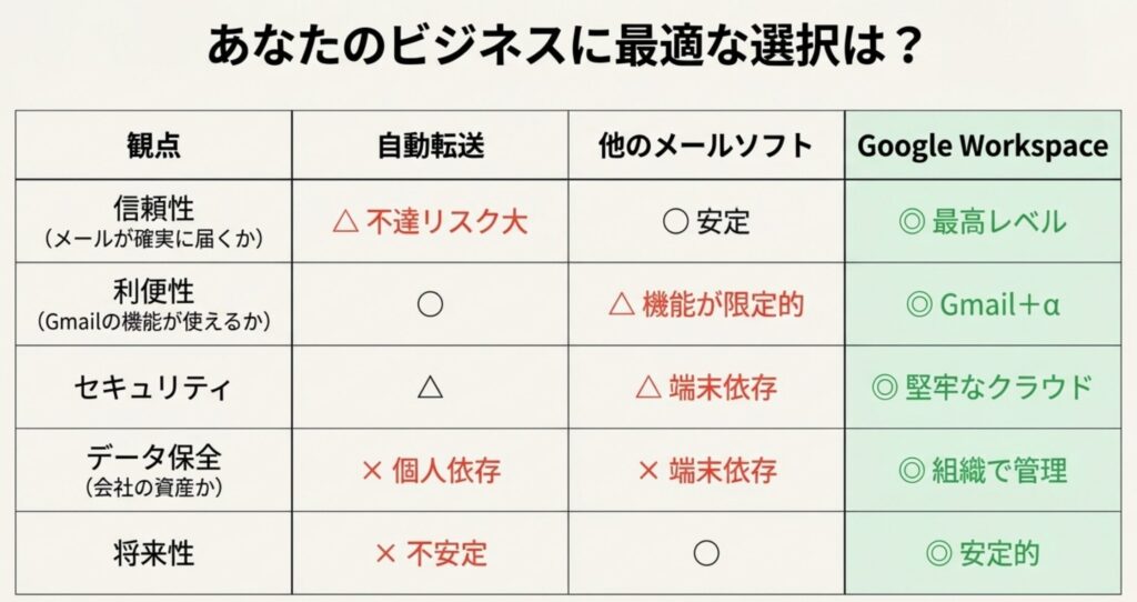 学習のヒント: この表からわかるように、多くの個人事業主や小規模なチームにとっては、無料で使い慣れた環境を維持できる「A. 自動転送」が最も現実的でバランスの取れた選択肢となります。次のセクションでは、この方法の具体的な設定手順を解説します。
