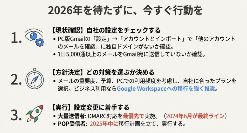 • 2026年1月から、PC版の無料Gmailで独自ドメインのメールを「POP受信」する機能が終了します。