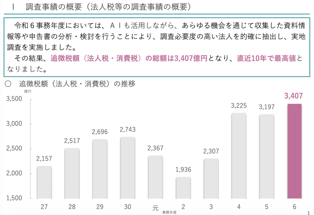 国税庁の最新レポート(令和6事務年度)によると、法人(会社)の税務調査によって新たに見つかった税金(追徴税額)の総額は、なんと3,407億円にも上りました。これは、過去10年間で最も高い金額です。