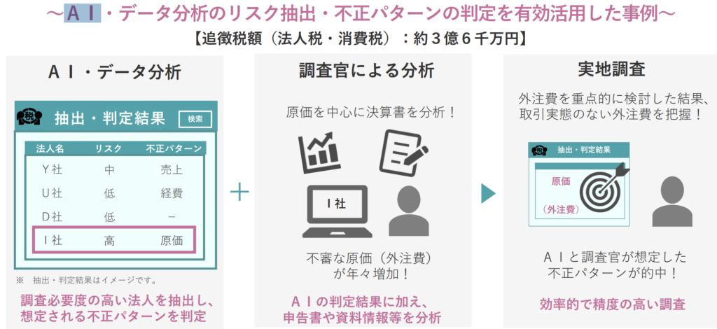 そこで実地調査を行った結果、I社が実際には取引のない架空の外注費を計上していたことが発覚。AIの予測通り、「原価」に問題があったのです。この調査により、I社には約3億6千万円の追加の税金が課されました。