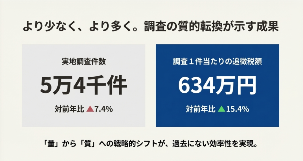 1. より賢く、より鋭く (Smarter and Sharper) 調査の戦略は「量より質」へとシフトしています。実地調査の件数は前年比で7.4%減少した一方で、調査1件あたりの追徴税額は15.4%も増加し、直近10年で2番目に高い水準となりました。これは、調査がより的を絞って、悪質なケースに集中している証拠です。