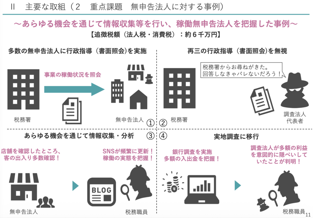 【事例:SNSと銀行口座から見つかった無申告法人】 ある法人に対して、税務署は事業を行っているか確認するために書面で問い合わせをしましたが、何度も無視されました。そこで調査官は、実地調査に切り替え、様々な情報を収集しました。