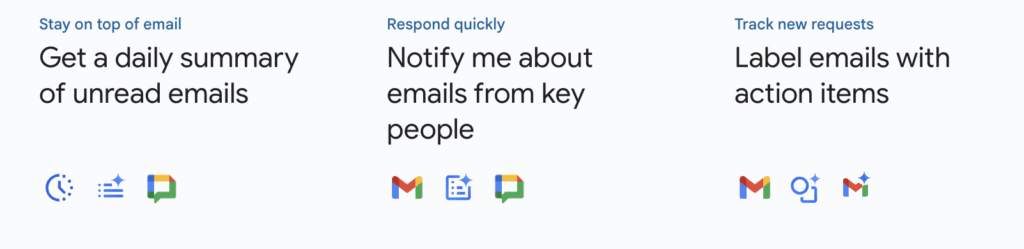 例えばメールだとこんな感じです。一日の読んでないemailのサマリを作ってチャットに通知したり、キーパーソンからのメールを通知したり、アクションが必要なメールにラベルを付けたり。メールは私はまだまだ仕事に使っていますが、未読のサマリーとか送られても、結局メール本文を読みにいけ無いので、そんなに便利機能には鳴らなさそうです。(私にとっては)