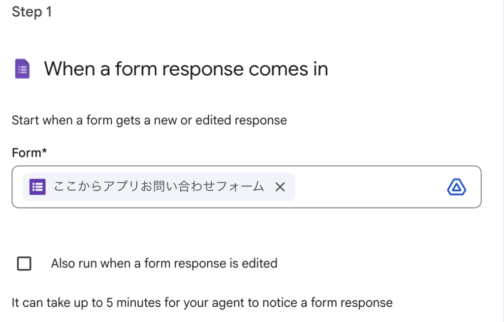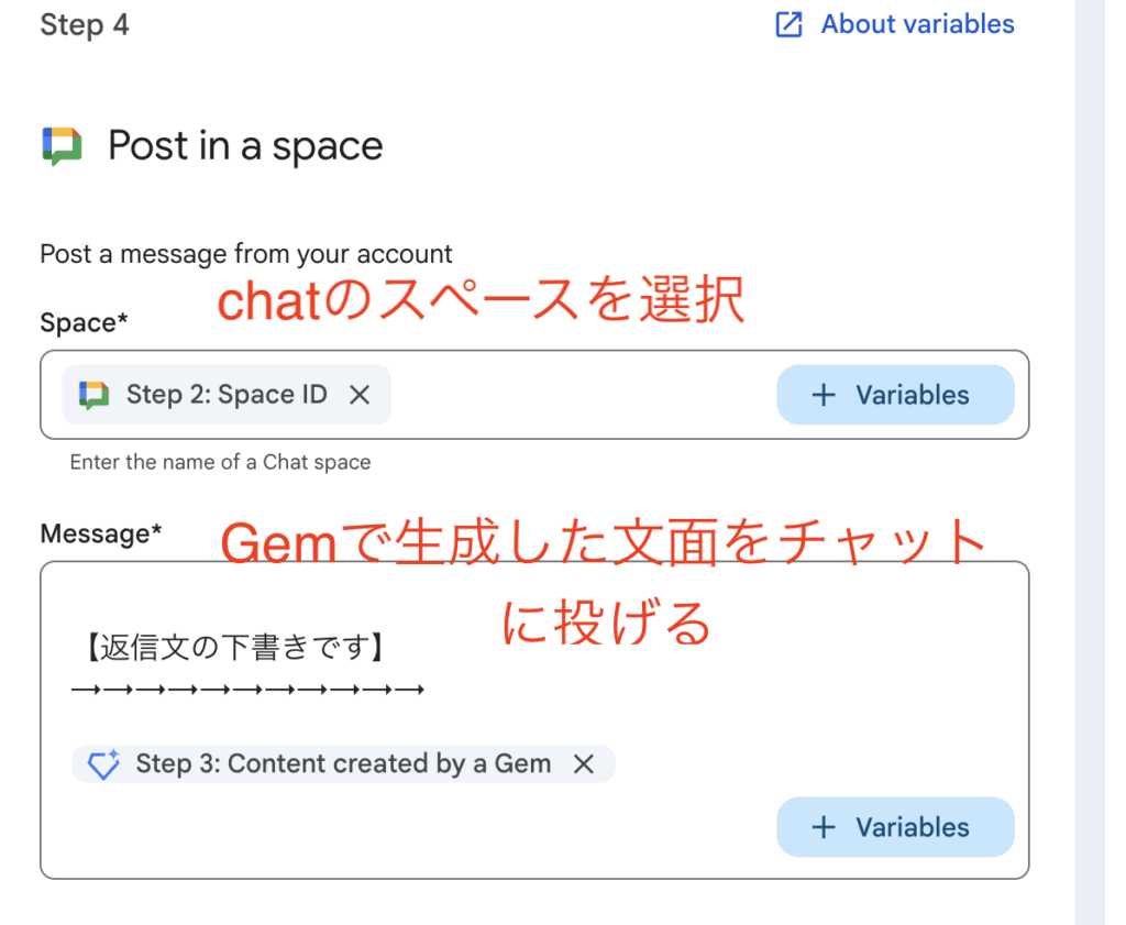 以下の4ステップの設定をしています。GoogleFromの問い合わせの回答文案を作ってチャットに通知する内容となっています。