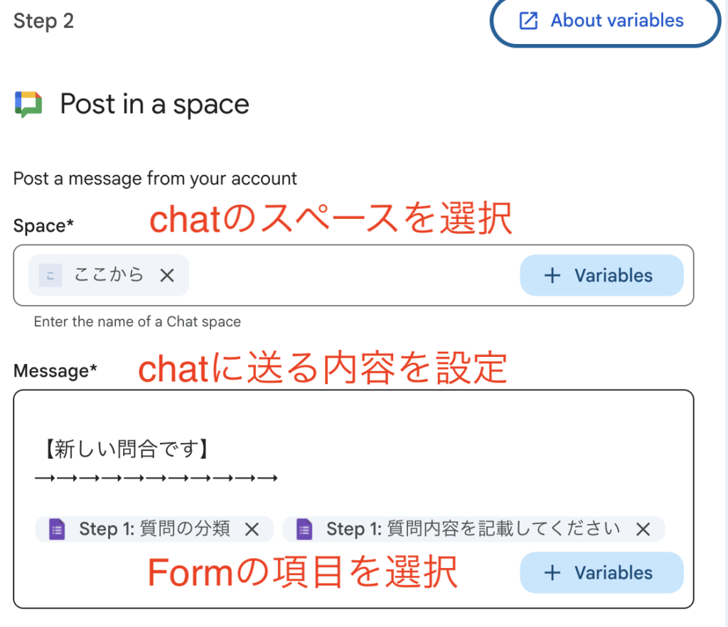 Gmail内でチャットのスペースを作って、問い合わせフォームの内容を投げる設定をしています