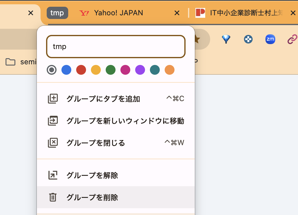 仕事が一段落ついたら、グループ削除で一括で閉じれます。グループを解除で、タブは残るけどグループは削除されます。便利ですね。