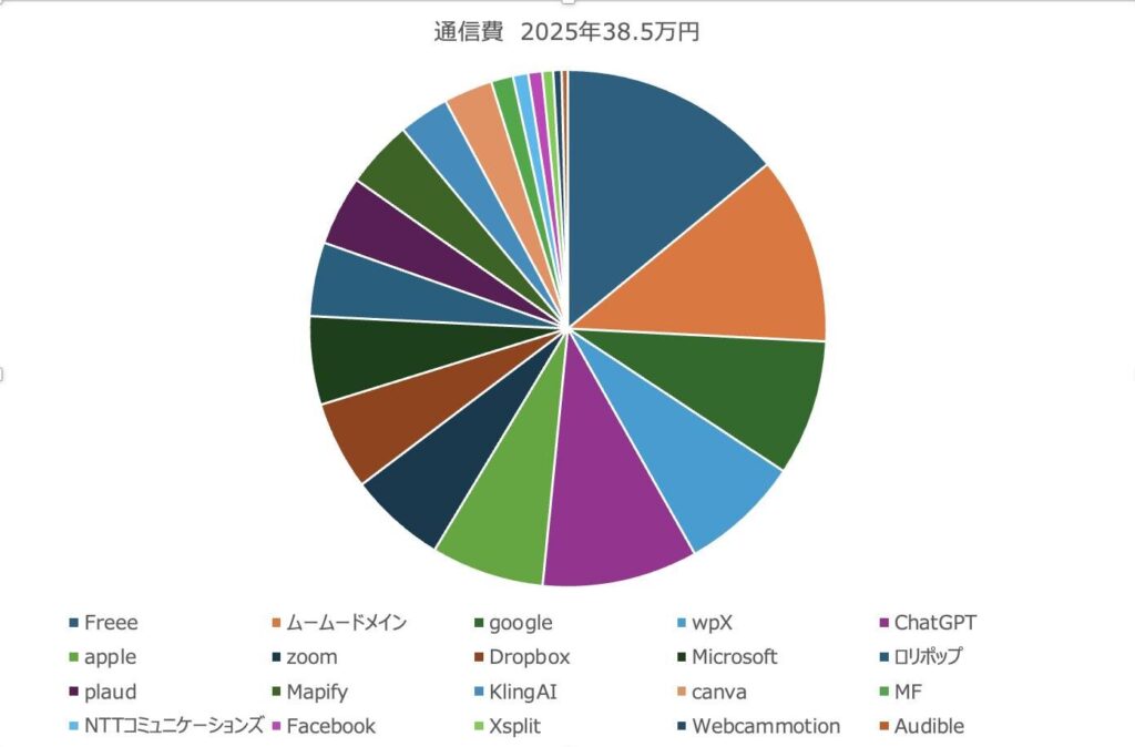 会社の経費として、ですが、通信費2025年集計しました。38.5万円。