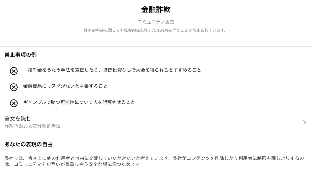 ちなみに金融詐欺コミュニティ規定を見ると、以下のような内容なので、削除はAIのミスなんでしょうかね。