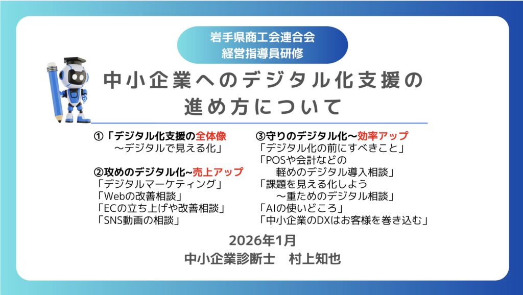 ことしの初めてのセミナーの仕事は経営指導員の方々向けのデジタル化支援のあり方についてでした。10時〜16時でオンラインで実施しました。オンラインは聞く方も大変ですね。