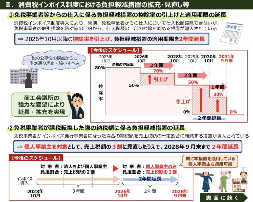 このように事業承継の円滑化が図られる一方で、日々の事業運営における税負担を軽減する措置もまた重要です。次に、消費税インボイス制度に関する負担軽減策の拡充について詳述します。