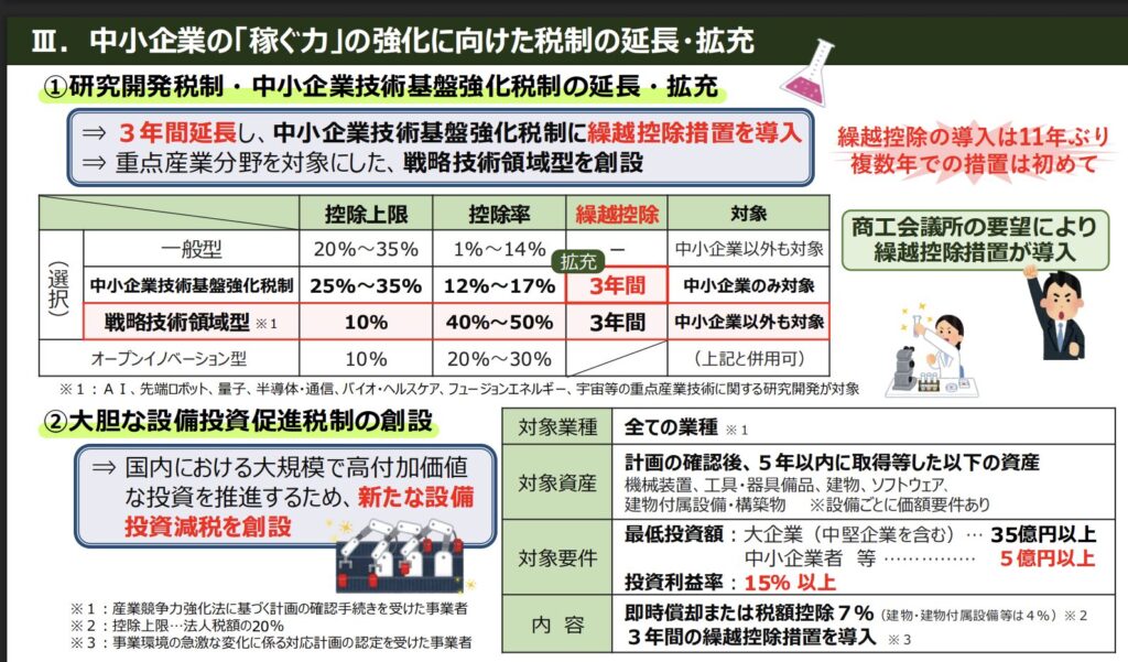日々の取引における税負担の軽減に加え、企業の成長を直接的に後押しする「稼ぐ力」の強化に向けた税制措置も拡充されました。続いて、研究開発に関する税制改正を解説します。