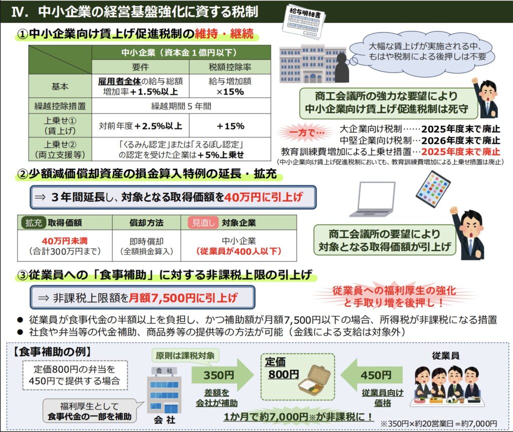 大幅な賃上げが進む中、「もはや税制による後押しは不要」との声も上がり、大企業・中堅企業向けの賃上げ促進税制は廃止・縮小されることになりました。しかし、商工会議所は中小企業の実情を訴え、中小企業向け税制を死守しました。その結果、本制度が維持され、中小企業が継続して賃上げに取り組みやすい環境が守られました。
