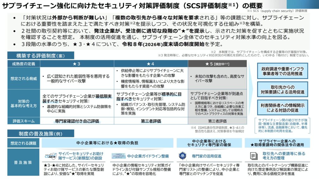この記事では、2026年度から本格的に始まるこの新しい制度、「SCS評価制度」とは何か、なぜ今必要なのか、そして企業はどう備えればよいのかを、特に中小企業にとって中心となる「★3」と「★4」の違いに焦点を当てて、誰にでも分かるように徹底解説します。
