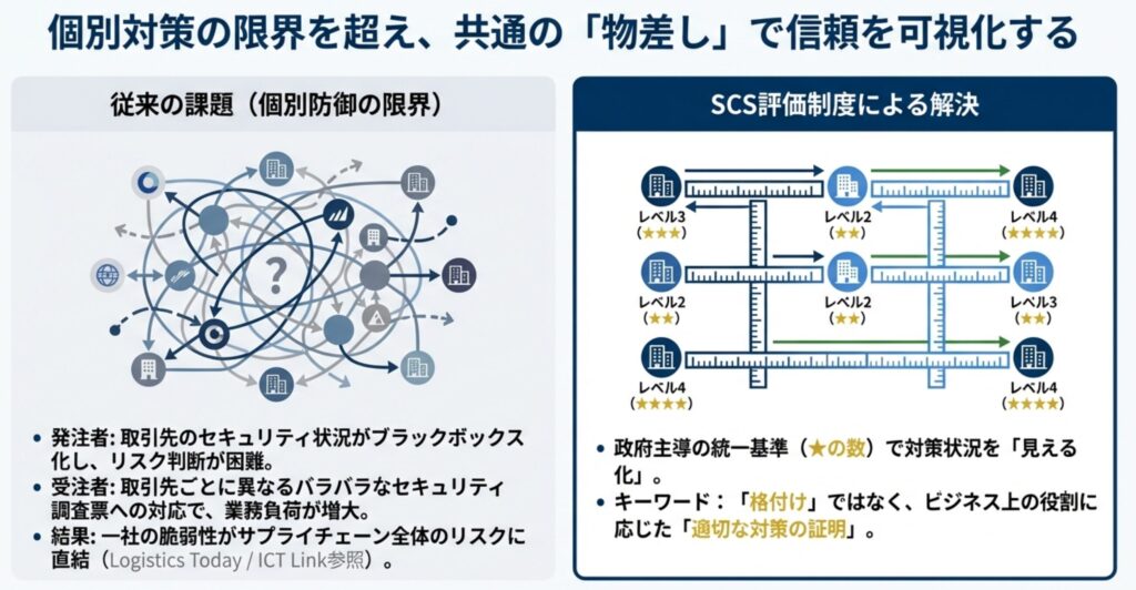 これらの課題が、サプライチェーン全体のセキュリティレベル向上を妨げる大きな壁となっていました。SCS評価制度は、この壁を取り払うために作られた、まさに待望の解決策なのです。