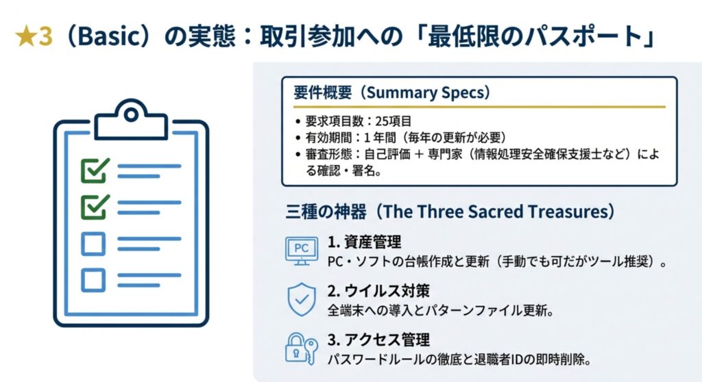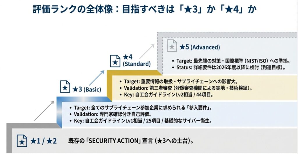 | ★3 (Basic) | 一般的なサイバー攻撃(広く認知された脆弱性を悪用) | サプライチェーン企業が最低限実装すべき基礎的なセキュリティ対策 | 専門家確認付き自己評価 |