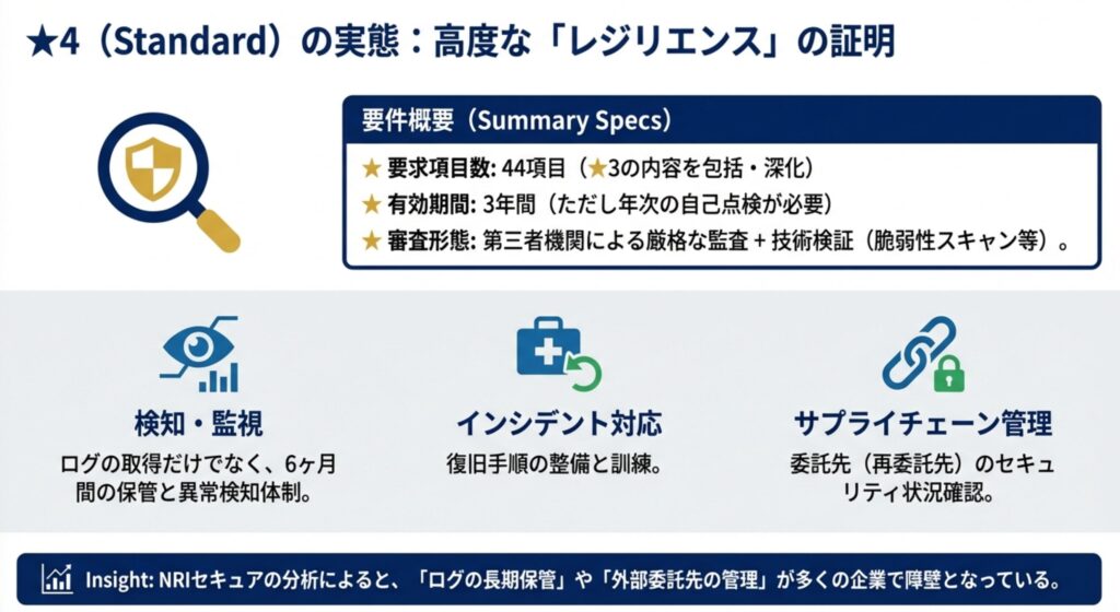 | ★4 (Standard) | サプライチェーンに大きな影響を与える攻撃や機密情報への攻撃 | 組織ガバナンス、取引先管理、システム防御、インシデント対応など包括的な対策 | 第三者評価 |