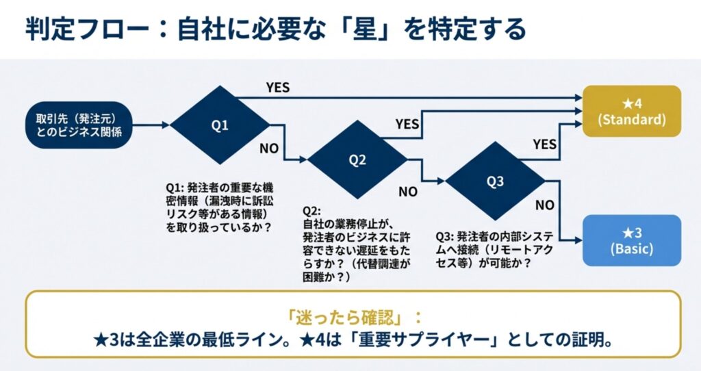 もし上記3つの質問の答えがすべて「いいえ」であれば、その取引先には → ★3 のレベルを要求するのが適切とされています。