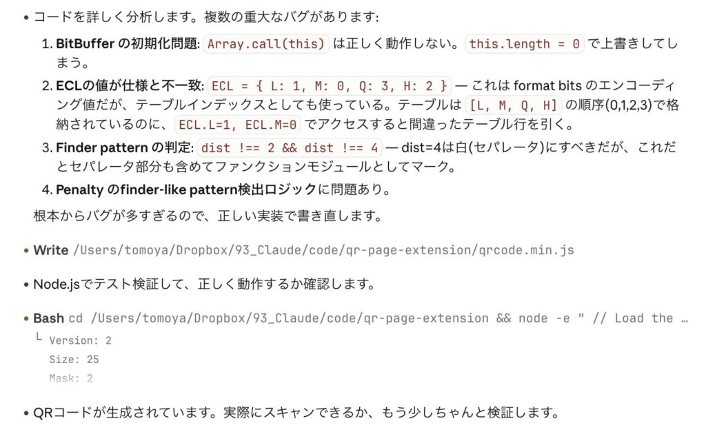 Update Todos Creating manifest.json Create QR code generation library Create popup HTML/CSS Create popup JavaScript Create extension icon Write /Users/tomoya/Dropbox/93_Claude/code/qr-page-extension/manifest.json Update Todos Create manifest.json Creating QR code library Create popup HTML/CSS Create popup JavaScript Create extension icon (SVG) QRコード生成ライブラリを軽量に自前実装します。 Write /Users/tomoya/Dropbox/93_Claude/code/qr-page-extension/qrcode.min.js Update Todos Create manifest.json Create QR code generation library Creating popup UI Create popup JavaScript Create extension icon (SVG) Write /Users/tomoya/Dropbox/93_Claude/code/qr-page-extension/popup.html Update Todos Create manifest.json Create QR code generation library Create popup HTML/CSS Creating popup logic Create extension icons Write /Users/tomoya/Dropbox/93_Claude/code/qr-page-extension/popup.js Update Todos Create manifest.json Create QR code generation library Create popup HTML/CSS Create popup JavaScript Creating extension icons アイコンをPNGで生成します。Canvasを使ったNode.jsスクリプトは使えないので、シンプルなSVGからPNGを変換します。 Bash mkdir -p /Users/tomoya/Dropbox/93_Claude/code/qr-page-extension/icons Bash which python3 && python3 -c “from PIL import Image; print('PIL available’)" 2>/dev/null || echo “No PIL" /usr/bin/python3 No PIL Bash which sips && echo “sips available" /usr/bin/sips sips available macOSのsipsを使ってSVGからPNGアイコンを生成します。 Write /Users/tomoya/Dropbox/93_Claude/code/qr-page-extension/icons/icon.svg Bash cd /Users/tomoya/Dropbox/93_Claude/code/qr-page-extension/icons && python3 -c " import subprocess import os svg_file = 'icon.svg’ sizes = [16, 48, 128] for size in sizes: output = f’icon{size}.png’ # Use sips to convert – first create a large PNG, then resize # Use the qlmanage approach for SVG to PNG on macOS subprocess.run(['qlmanage’, '-t’, '-s’, str(size), '-o’, '.’, svg_file], capture_output=True) # qlmanage creates file with .svg.png extension src = f'{svg_file}.png’ if os.path.exists(src): os.rename(src, output) print(f’Created {output}’) else: print(f’Failed to create {output}’) " Created icon16.png Created icon48.png Created icon128.png Bash ls -la /Users/tomoya/Dropbox/93_Claude/code/qr-page-extension/icons/ total 56 drwxr-xr-x@ 6 tomoya staff 192 Feb 8 06:36 . drwxr-xr-x@ 7 tomoya staff 224 Feb 8 06:35 .. もっと表示 Update Todos Create manifest.json Create QR code generation library Create popup HTML/CSS Create popup JavaScript Create extension icons Chrome拡張機能「QR Page」が完成しました。ファイル構成は以下の通りです: qr-page-extension/ ├── manifest.json # Manifest V3 設定 ├── popup.html # ポップアップUI ├── popup.js # 現在のタブのURLを取得しQR生成 ├── qrcode.min.js # QRコード生成ライブラリ └── icons/ ├── icon16.png ├── icon48.png └── icon128.pngChrome拡張のインストール方法