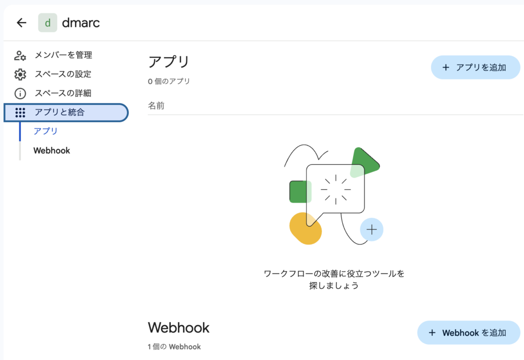 - スペース名の横の ▽ をクリックし、「アプリと統合」 > 「Webhookを追加」 を選択します。