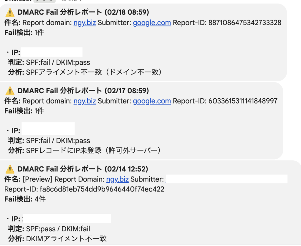 メールのセキュリティを高めるため、Dmarc等の設定を行いました。レポートが毎日2通くらい来ます。