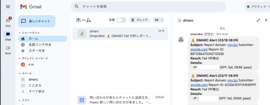 dkimやspfがfailになっている件数をカウント。 - 通知: 問題がある場合のみ、Google Chat のスペースに要約を送信。