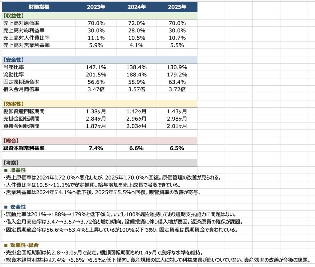 “財務諸表分析用元データ” をダウンロード BSPL-claude元データ.xlsx – 1 回のダウンロード – 15.13 KB財務指標の算出と考察
