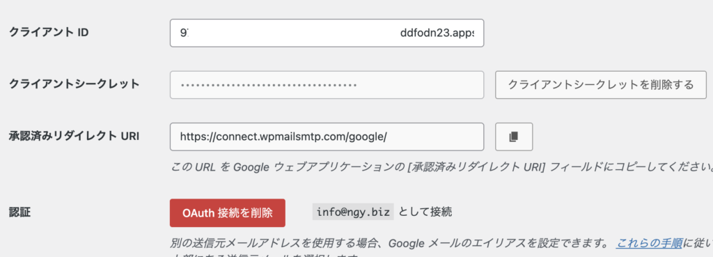 そして、IDとPassword的なものを入れて完了!・・・かと思いきや、クライアントIDとクライアントシークレットをなどを入れるとのこと。。。 これGoogleWorkspaceのAPIの設定から取るのですが、結構道に迷いそうでした。。