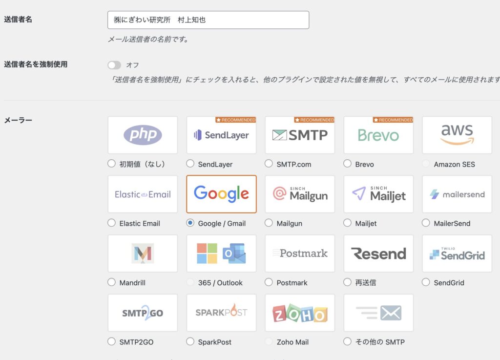 送信者名をいれて、メーラーを選びます。私はGoogleWorkspaceなのでGoogleを選択。