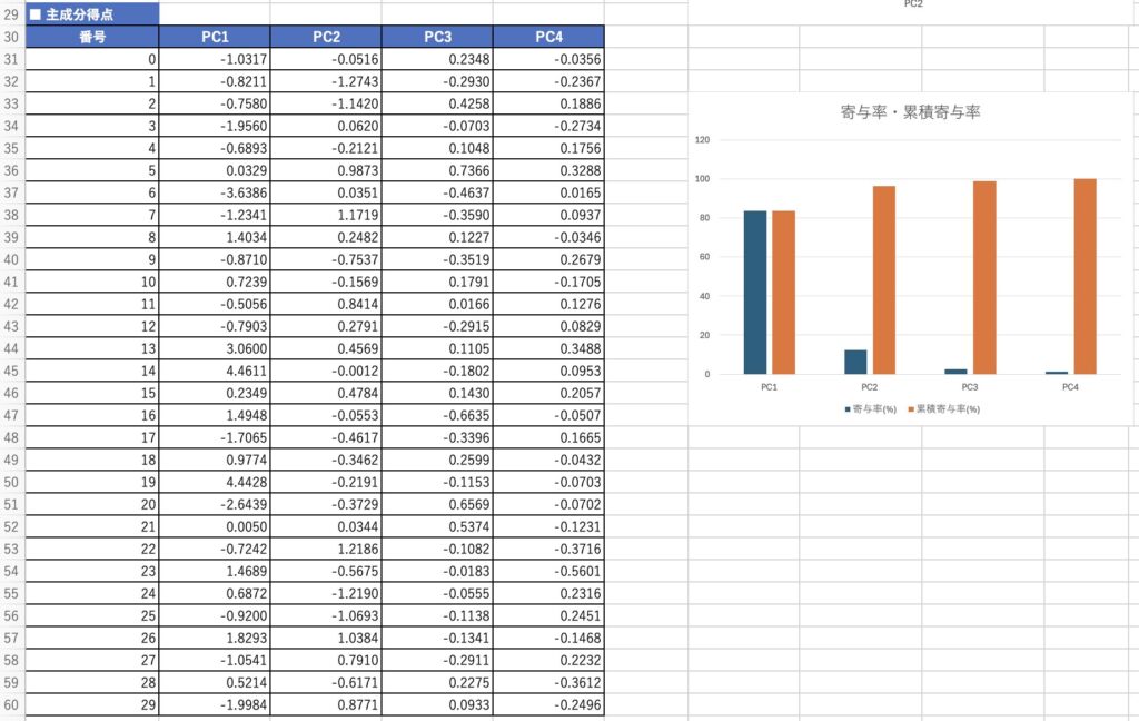 | 主成分 | 固有値 | 寄与率 | 累積寄与率 |