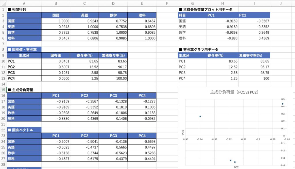 - PC1(総合学力): 全4科目の負荷量がほぼ均等に高い(-0.88〜-0.94)。すべての科目に共通する「総合的な学力」を表します。