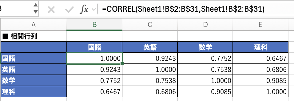 - 数学と理科も高い相関(0.909)、理系科目同士の強い関連