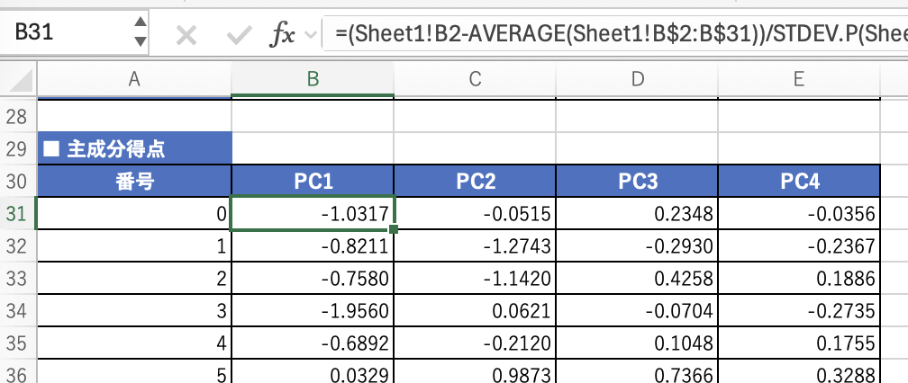 途中の固有値やベクトルなどは数値になっていましたが、主成分得点にはなにか数式が入っていますね。